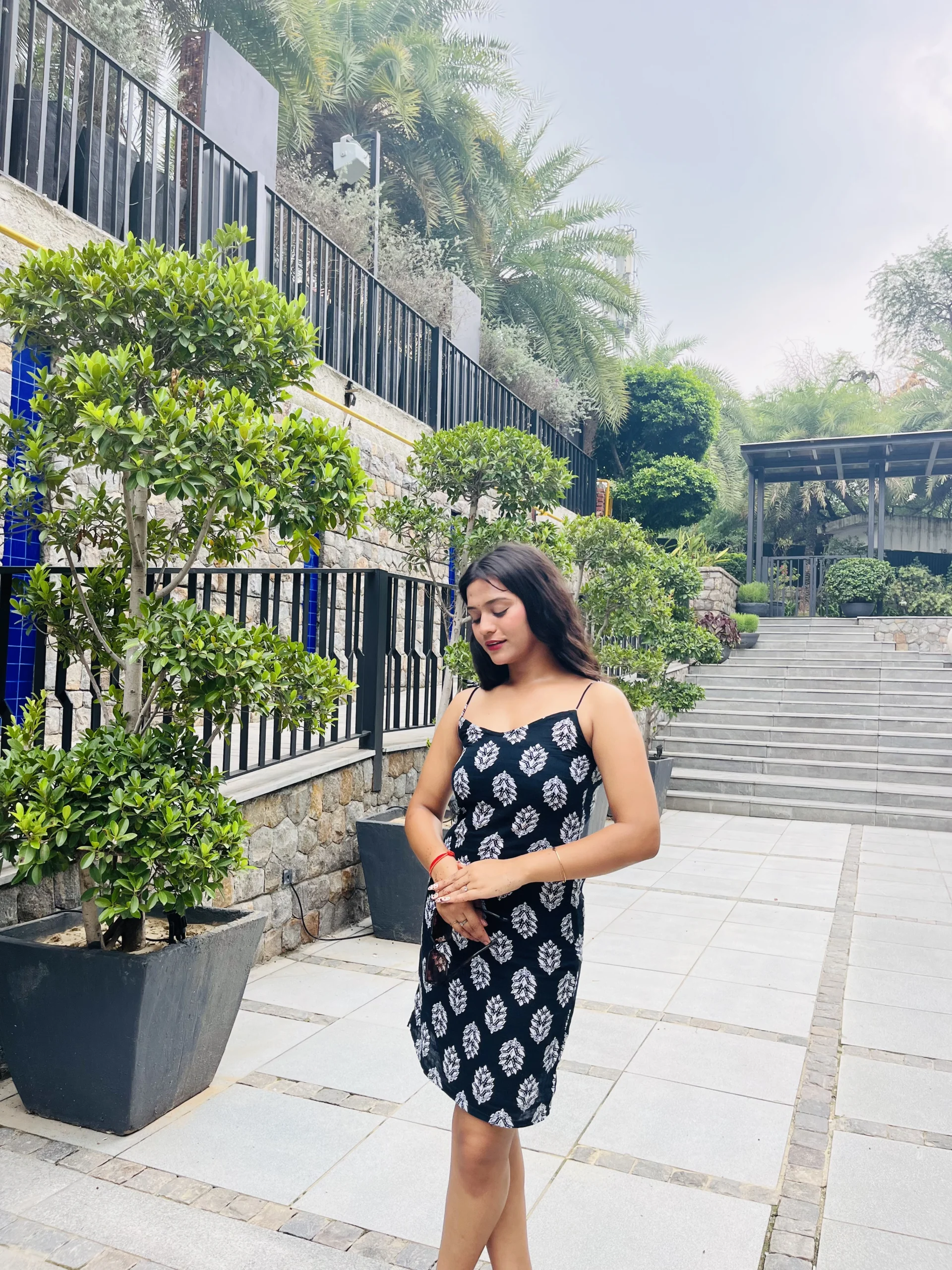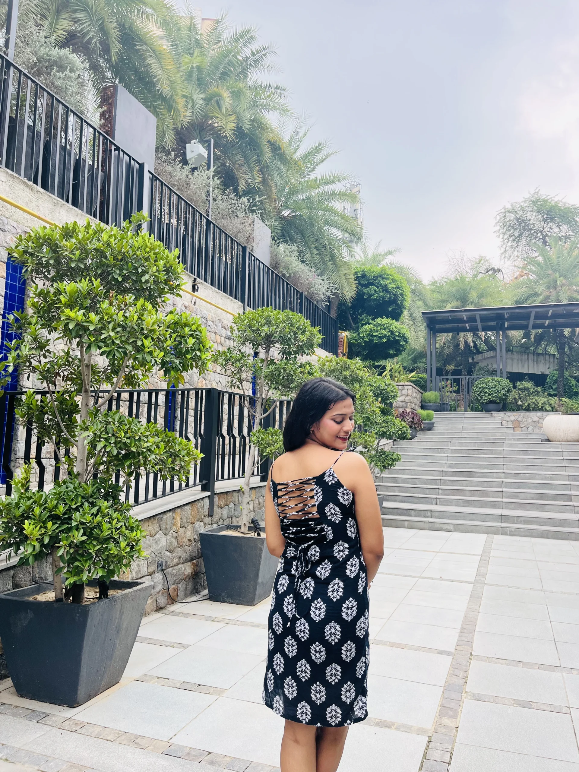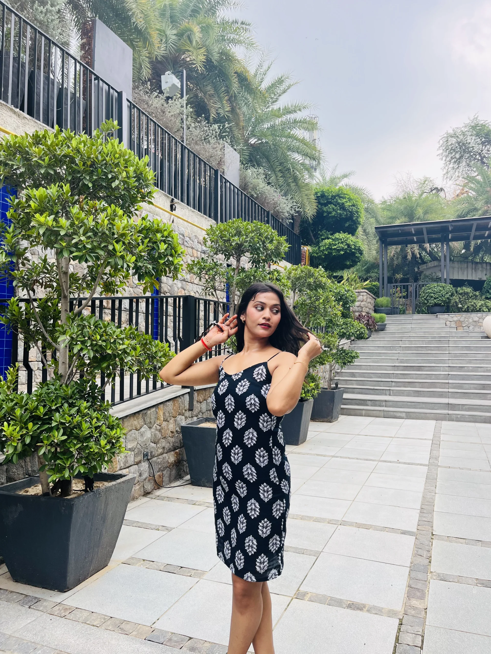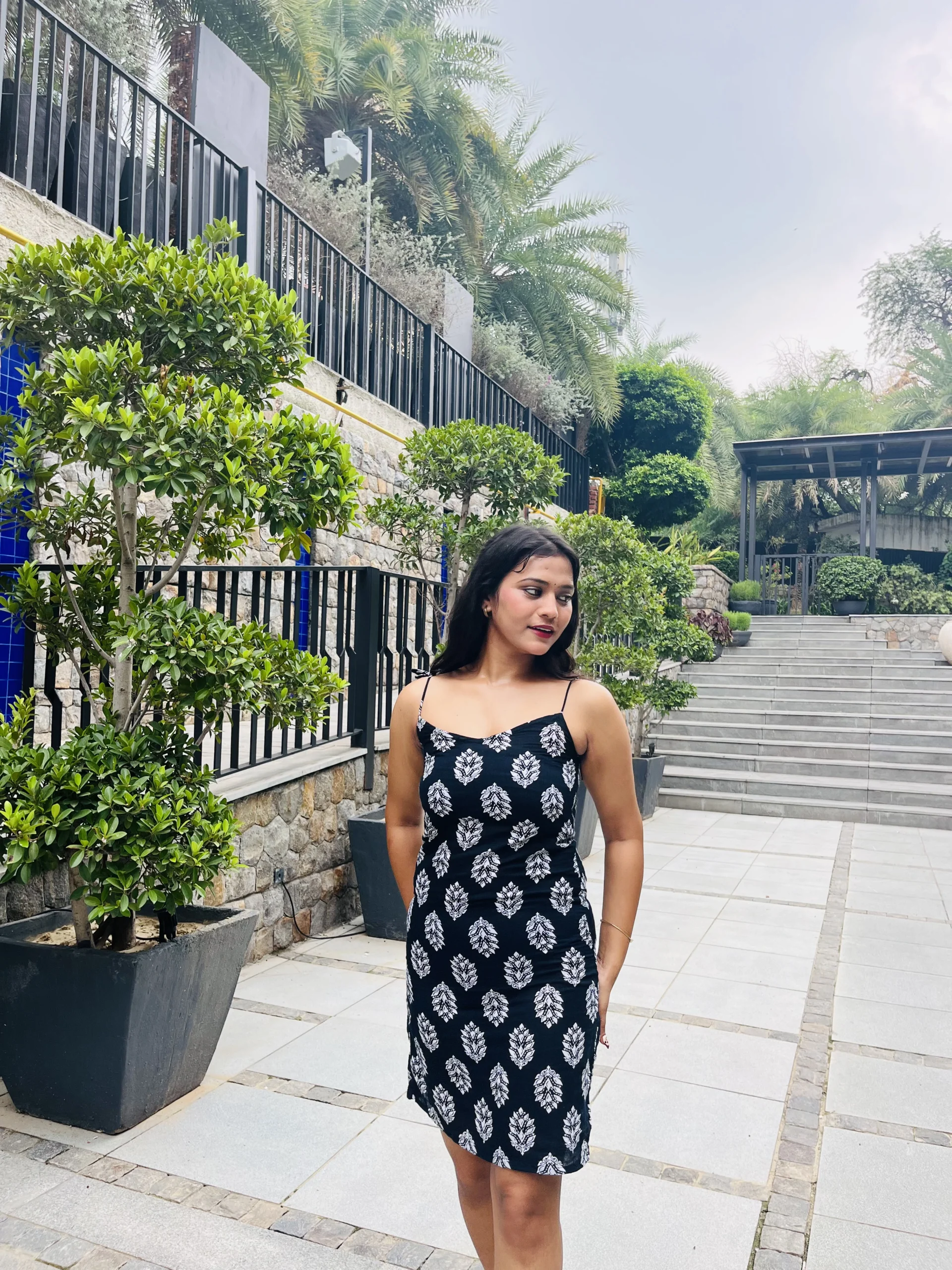 The delicate white leaf print dances against the midnight black backdrop, creating a timeless design that feels both serene and confident. Adjustable back ties let you define your silhouette your way – a soft bow for a sweet brunch date, or a sleek knot for that confident, head-turning evening look.